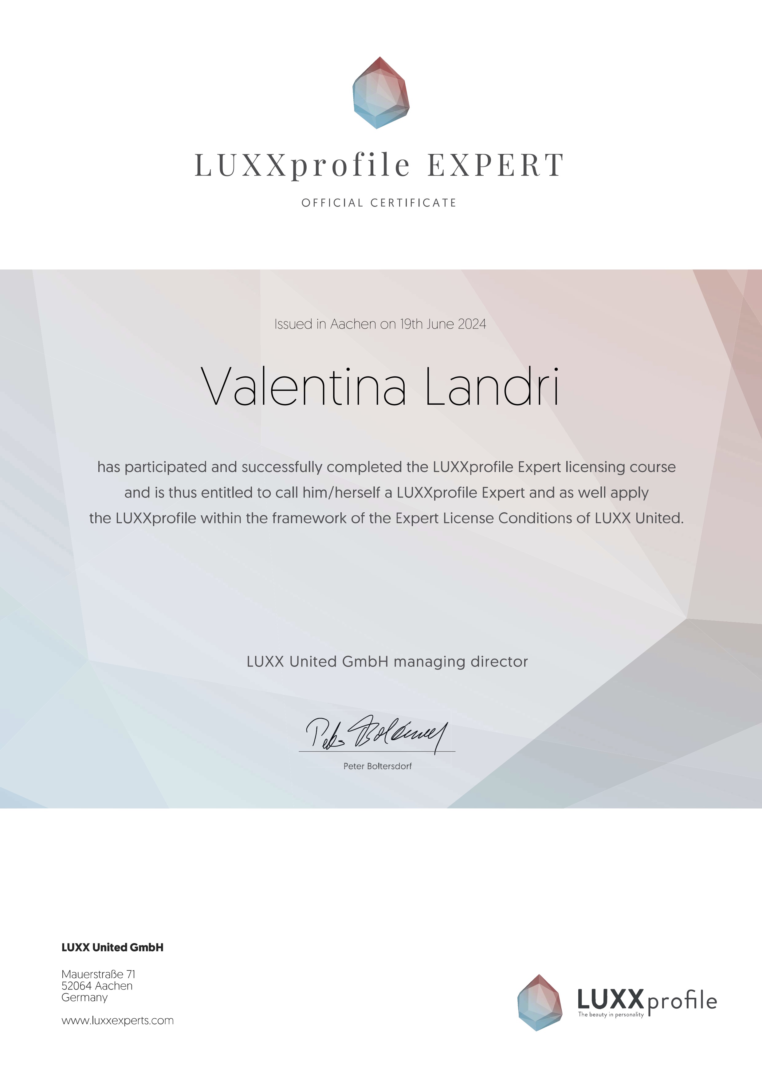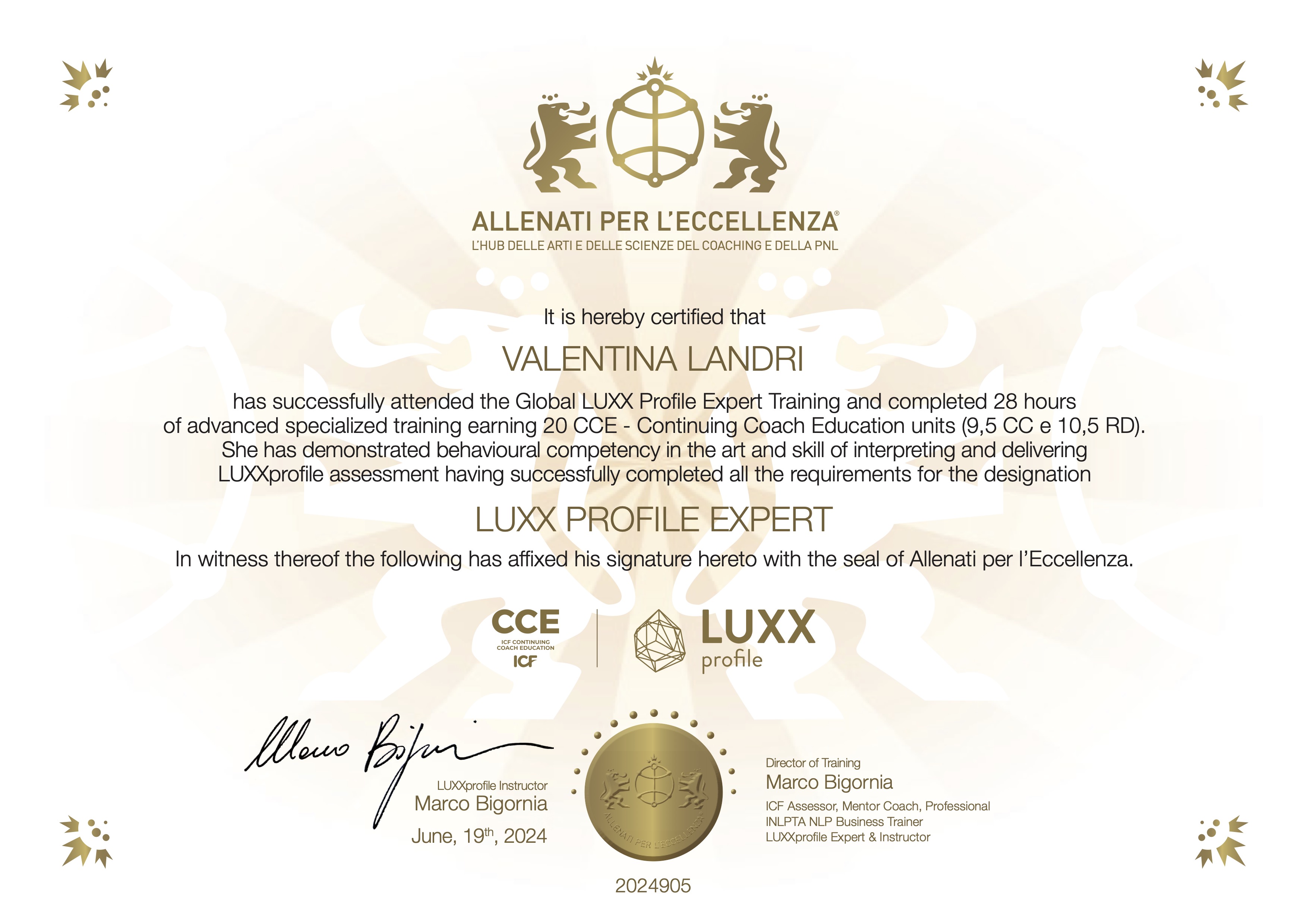 Oltre alle sue qualifiche accademiche, Valentina è una figura di fiducia per migliaia di persone che la seguono sui social e partecipano ai suoi percorsi. Attraverso programmi innovativi e strumenti come il LUXX Profile Test, Valentina aiuta i suoi clienti a comprendere a fondo i propri bisogni e motivazioni nelle relazioni, guidandoli verso scelte più consapevoli e allineate. Il suo metodo è pensato per offrire supporto personalizzato e risultati concreti, sia per chi cerca di superare difficoltà relazionali sia per chi desidera costruire un legame duraturo e appagante. Con Valentina Landri, non trovi solo una coach, ma una guida espertapronta a farti raggiungere l’amore e la serenità che meriti.